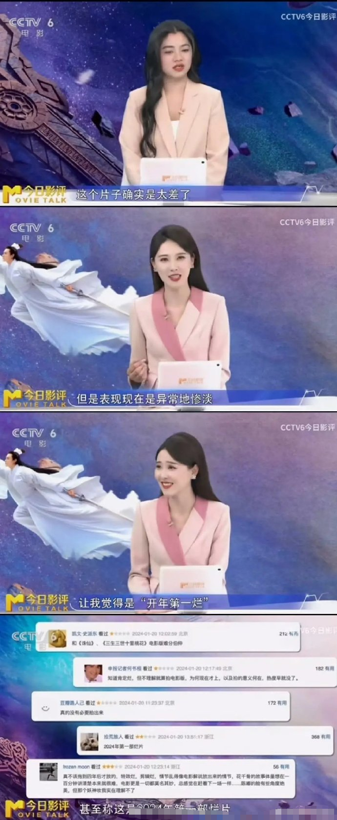 除此,主持人在节目中也表示,对于观众评价电影《花千骨》是2024年第一部烂片是不信的,但是买票进了影院后发现真的可能是“开年第一烂”。最后,主持人也表示要把电影拍热,最终还是要看电影人是否有一颗对创作的热忱之心。