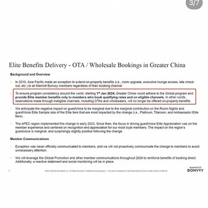 在前述社交平台用户分享的万豪内部资料中,万豪表示,取消白金卡及以上会员在第三方预订的会员待遇对于客户满意度的负面影响很小,因为这些等级的会员所占整体预订量的比例较小。