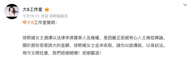 24日晚,大S工作室发声明称,“徐熙媛女士选择以法律来保护家人及维权,是因严正拒绝有心人士操控舆论。关于部份(分)恶意夸大的金额,徐熙媛女士并未收取,请勿以讹传讹,以身试法。现今文明社会,我们拒绝爆(暴)!拒绝霸凌!