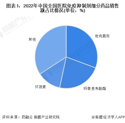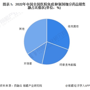 免疫抑制剂行业药品种类繁多,但我国免疫抑制剂行业多年来始终是他克莫司、吗替麦考酚酯和环孢素三个品种占据主要地位。根据药融云披露的数据,2022年,全国医院免疫抑制剂销售额中,他克莫司、吗替麦考酚酯和环孢素分别占比约31%、23%和13%左右。