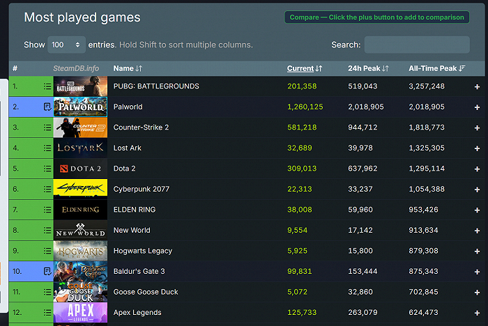 根据游戏数据库网站SteamDB的数据显示,《幻兽帕鲁》Steam同时在线人数最高达到201万,成为史上同时在线玩家数量最高的付费游戏之一,仅次于《绝地求生》的325万。以该势头预计,《幻兽帕鲁》销量很快会达到1000万份。