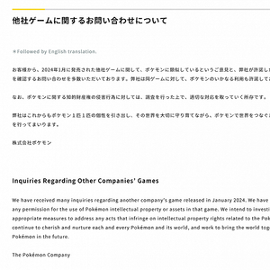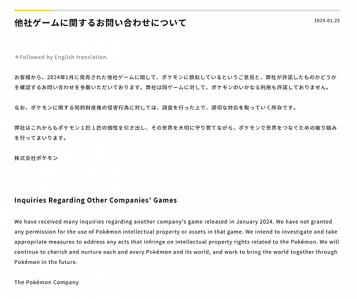 1月25日,任天堂参股的宝可梦公司在官网间接回应了对《幻兽帕鲁》爆火后的看法。