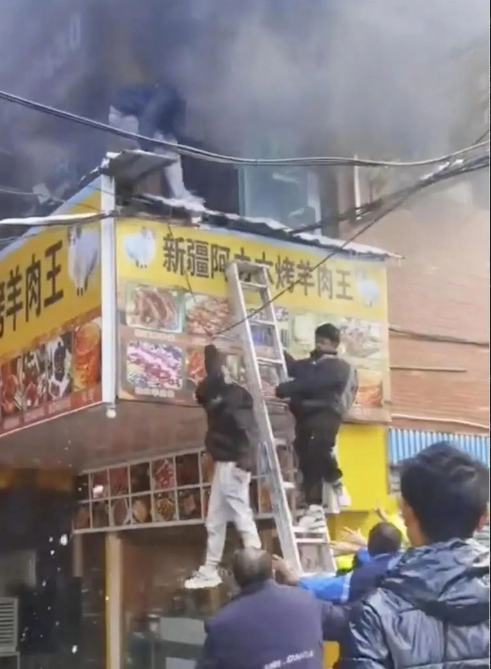 在另一条视频中,民警和热心市民顺着一楼烧烤店架起了梯子,几名男学生先后从窗户爬出顺着梯子逃生,一名男学生顺着梯子下了几节之后,脚下一滑,慌乱中抓着电线摔在了地上。