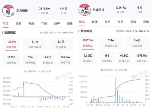值得关注的是,据媒体近期多次统计,东方甄选、与辉同行两大账号同时开播时,不论是早上、午间还是晚上的黄金带货时段,与辉同行在线观看人数、成交规模、评论点赞互动指数均超东方甄选一倍以上。灰豚数据显示,目前与辉同行仍然在以每天超10万的涨粉速度快速扩大影响力,东方甄选则每天仍在掉粉1万至数万不等。
