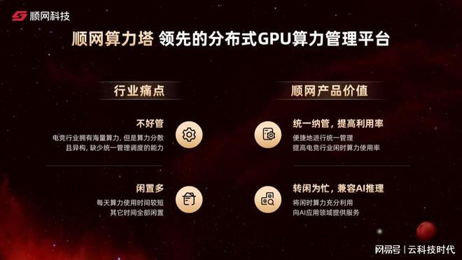 有了算力池和算力市场,接下来要解决的就是边缘算力的调度,这就是顺网算力塔。顺网算力塔是一个分布式GPU算力管理平台,旨在解决行业算力“不好管”、“闲置多”两大痛点问题,实现算力的统一管理,将闲时算力向AI应用领域提供服务,兼容AI推理。