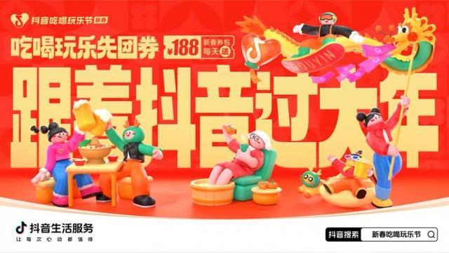 1月25日,抖音生活服务上线“抖音新春吃喝玩乐节”活动,联合数十万商家,陆续推出“焕新变美日”“新春囤货日”等14个品类日,为消费者提供美发美甲、休闲娱乐等多项团购。活动将持续至2月17日,为期24天。活动期间,消费者每天都可以在抖音抢188元新春券包。