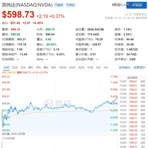1月22日,是英伟达历史股价最高点,当日最高603.31美元,23日收盘价为598.73美元,自年初以来已上涨 24%,总市值高达1.48万亿美元。