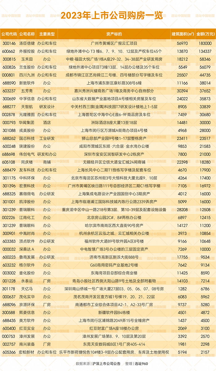 根据沪深两地交易所披露,选址960不完全统计发现,2023年有40家上市公司公告了购买房产的决策或者进展,涉及相关金额101.88亿元,建筑面积46.64万平方米,粗略计算,平均楼面价2.18万元/平方米。