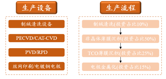 HJT是在晶体硅上沉积非晶硅得到的,工艺路径为全新。HJT工艺仅有四步:清洗制绒、非晶硅薄膜沉积、TCO薄膜制备和丝网印刷,对应的设备分别是湿法化学清洗设备、PECVD、PVD/RPD、丝网印刷/激光转印/铜电镀设备,技术成熟。