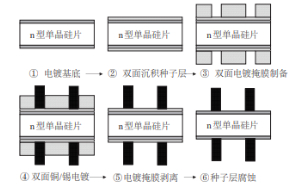 电镀铜技术属于一种特殊的电解过程,利用电解原理在导电层表面沉积铜,主要基于种子层栅线的方法替代丝网印刷制作电极,一般使用含银的电镀液,再用铜镀层,从而减少银浆用量,或者用铜镀层完全代替银浆,使成本更具有竞争力。