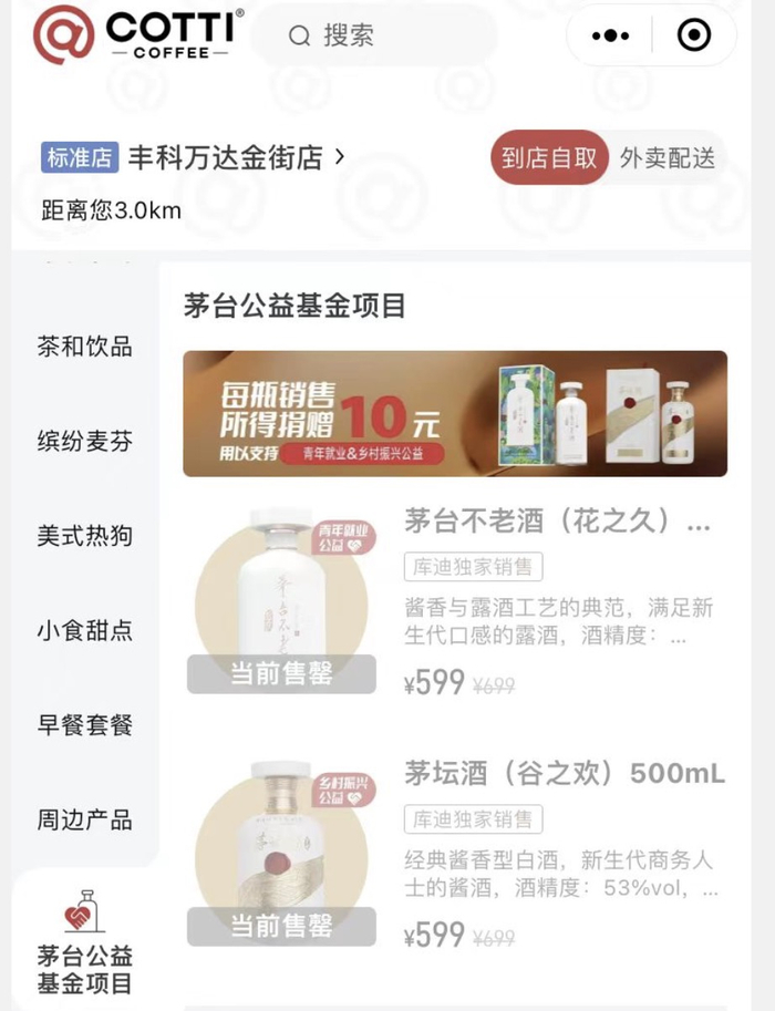 两名库迪加盟商向界面新闻证实,由于遭到加盟商强烈反对,库迪确实取消了上述“骚操作”,在库迪小程序也能看到,多数门店均上架了两款茅台公益基金项目白酒产品,分别是茅台不老酒和茅坛酒,售价500元,但大部分门店显示售罄。