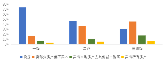 二线城市,换房和卖部分房产占到80%,三四线城市卖部分房产是大头,同样异地买房需求上升,清空所有房产的占比也是最高的。