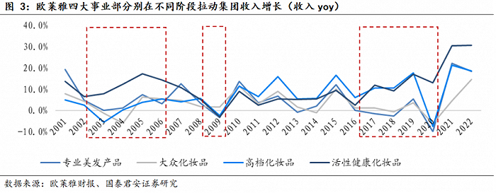 从欧莱雅的业绩曲线来看,从2021年开始,拉动集团增长的主要力量从高端化妆品交棒至活性健康化妆品(2023年更名为皮肤医学美容部)部门,广为大众所知的功效护肤品牌理肤泉、薇姿、适乐肤、修丽可同属这一部门。