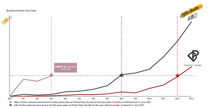 小奥汀在重新启动后的第8个月,即达到完美日记第12个月销售额水平,完子心选则将这一时间缩短至第3个月 资料来源:逸仙电商招股书
