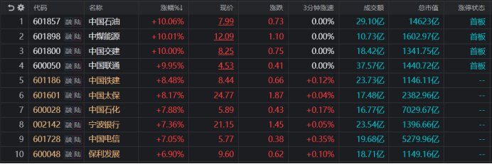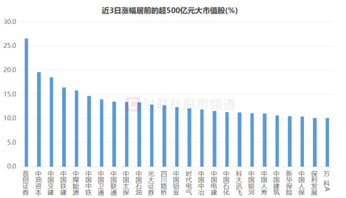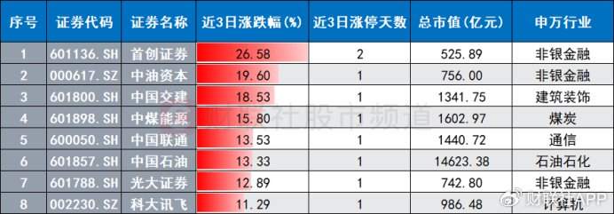 近日,权重股成为市场反攻主力,截至今日收盘,超500亿元的个股近3日平均上涨近5%。其中,首创证券、中油资本、中国交建、中国铁建、中煤能源等25股的股价3日内已反弹超一成。值得注意的是,多只巨头股近日也上演“铁树开花”,其中,首创证券近3日共获涨停2次,中油资本、中国交建、中煤能源、中国联通、中国石油、光大证券、科大讯飞也录得涨停行情。