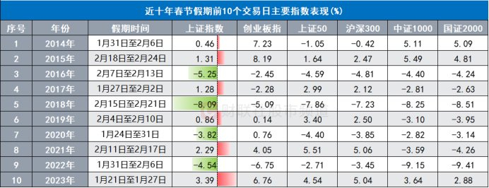 注:市场主要指数近十年(2014年至2023年)春节前10日行情表现