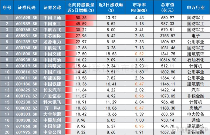 此外,从资金面来看,不少权重股近日也获北向资金重点加仓。截至1月24日数据,累计共有112只超500亿元大市值股近5日获北向增持,其中,中国卫通北向持股数量近日飙升,合计增长超50%,中国重工、中航西飞、中芯国际、龙源电力持股数量增幅也分别达到45.6%、30.2%、28.0%、23.0%。从增持规模居前的个股行业分布上看,国防军工股数量较多。