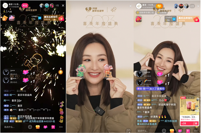 在直播的内容形式和IP资源的结合上,喜茶也做出了差异化。现场邀请到了“高热主播”、演员高海宁,参与直播预热和现场互动。在预热阶段,高海宁抖音号及喜茶品牌官方抖音号同步发布预热短视频,高海宁变身“Cathy姐”,走上主播台带来“喜TV prime time news”,通过大众喜闻乐见的新闻播报方式,以接地气的语言和轻松的气氛,吸引用户关注,拉满了直播的期待值。不少用户更是喊话官方:“让我们家Cathy姐一周播七天”。直播当天,高海宁则化身超模,空降直播现场走秀,带领观众沉浸式互动看展,与「喜茶」的年度饮品、年度联名等爆品同框。通过创意内容结合明星IP,喜茶从平台端和内容消费端全面激活流量,成为年轻人跨年的一大热议焦点。