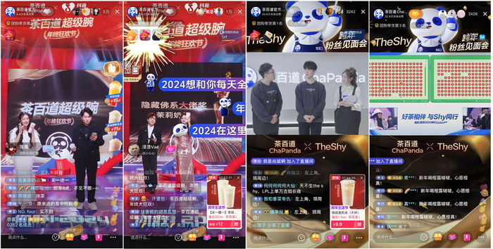 在明星合作上,茶百道的选择更加垂直。在“超级腕”直播现场,茶百道邀请电竞明星the shy空降茶百道官方宠粉号和品牌号直播间,在品牌直播之外为用户拓展出了“粉丝见面会”的新形式。the shy现场与线下粉丝互动聊天、学习制作茶百道奶茶、和粉丝互动游戏不断引爆全场氛围,迅速拉升直播间人气。此次活动期间,茶百道销售额达6200万,直播间曝光量也达到2.2亿+。