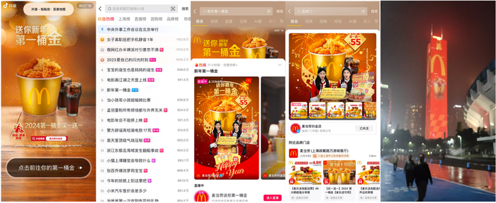 不仅如此,麦当劳还依靠强大的品牌效应和抖音生活服务的资源加持,打通线上线下流量实现双向引爆。站内,麦当劳热点话题#新年第一桶金 登上抖音热点榜第6名,开屏广告强势曝光,为品牌跨年活动造势蓄力;线下借势抖音生活服务在三亚草莓音乐节、广州中信塔大屏等户外投放资源,辐射城市核心地段,配合城市大巴户外广告等渠道,实现了品牌活动的强曝光。