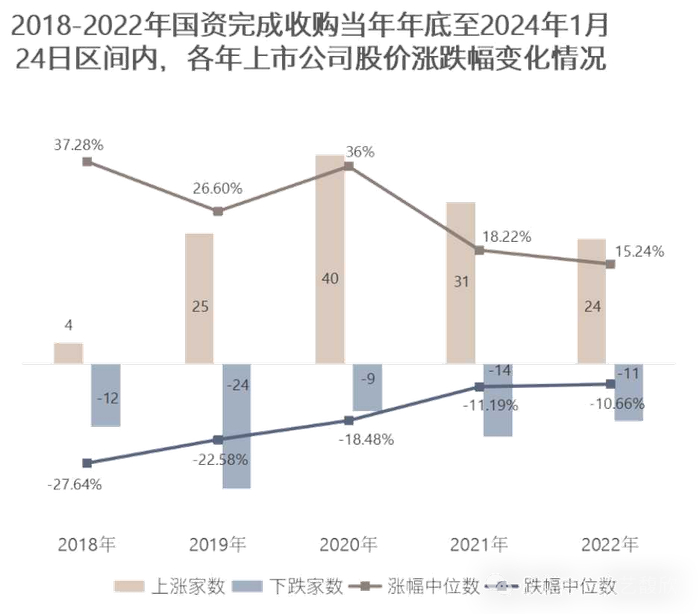 在国资完成收购当年年底至2024年1月24日的区间内,分年看上市公司股价相较沪深300的涨幅情况,2018年有4家公司上涨,中位数涨幅为37.28%;12家公司下跌,中位数跌幅为-27.64%。2019年有25家公司上涨,中位数涨幅为26.60%;24家公司下跌,中位数跌幅为-22.58%。2020年有40家公司上涨,中位数涨幅为36.26%;9家公司下跌,中位数跌幅为-18.48%。2021年有31家公司上涨,中位数涨幅为18.22%;14家公司下跌,中位数跌幅为-11.19%。2022年有24家公司上涨,中位数涨幅为15.24%;11家公司下跌,中位数跌幅为-10.66%。