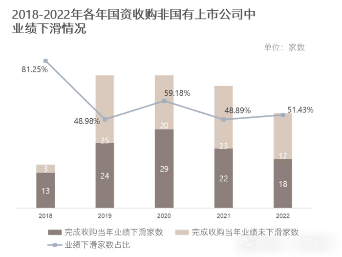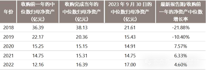 分年来看,2018年完成收购的16家中有13家扣非净利润下降,中位数降幅为-79.15%;3家扣非净利润增长,中位数增长率为7.83%。2019年完成收购的49家中有24家扣非净利润下降,中位数降幅为-227.17%;25家扣非净利润增长,中位数增长率为63.01%。2020年完成收购的49家中有29家扣非净利润下降,中位数降幅为-38.04%;20家扣非净利润增长,中位数增长率为61.21%。2021年完成收购的45家中有22家扣非净利润下滑,中位数降幅为-92.94%;23家扣非净利润增长,中位数增长率为101.26%。2022年完成收购的35家中有18家扣非净利润下滑,中位数降幅为-23.00%;18家扣非净利润增长,中位数增长率为100.89%。