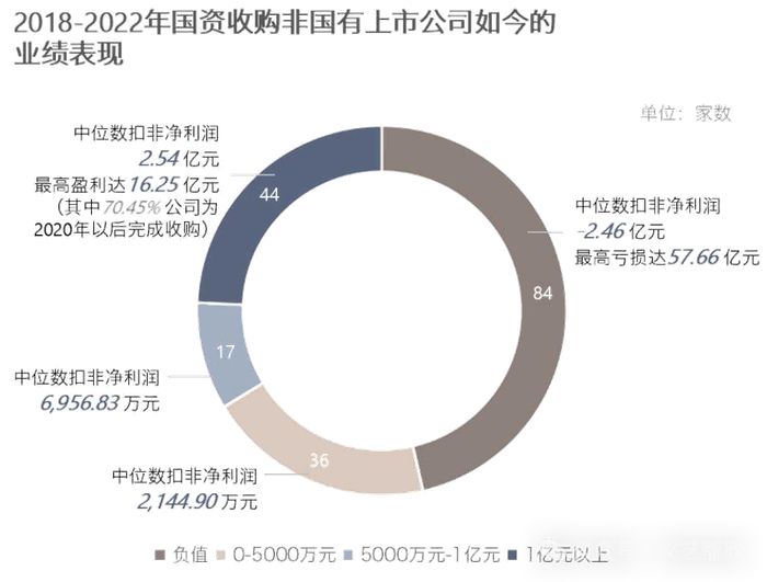 收购完成后至今,已有4家上市公司退市,8家“披星戴月”。除了上述12家及借壳情形,181家公司的2022年扣非净利润中位数值为428.85万元。其中扣非净利润为负值的有84家,中位数扣非净利润为-2.46亿元,最高亏损达57.66亿元;扣非净利润在0-5,000万元区间的有36家,中位数扣非净利润为2,144.90万元;扣非净利润在5,000万元-1亿元区间的有17家,中位数扣非净利润为6,956.83万元;扣非净利润在1亿元以上的有44家(其中70.45%公司为2020年以后完成收购),中位数扣非净利润为2.54亿元,最高盈利达16.25亿元。
