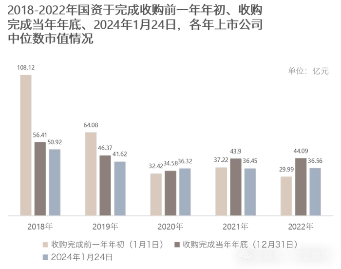 以国资收购完成前一年年初(1月1日)、收购完成当年年底(12月31日)、2024年1月24日为维度,分年度划分,2018年被收购的上市公司中位数市值分别为108.12亿元、56.41亿元、50.92亿元。2019年分别为64.08亿元、46.37亿元、41.62亿元。2020年分别为32.42亿元、34.58亿元、36.32亿元。2021年分别为37.22亿元、43.90亿元、36.45亿元。2022年分别为29.99亿元、44.09亿元、36.56亿元。