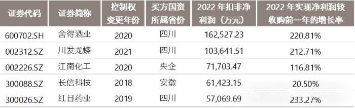 从上一部分的内容看,有超过一半的被国资收购的上市公司在收购完成后出现了业绩或者市值的下滑,但也有部分上市公司被收购后业绩和市值表现较好。这类公司多为带产业的上市公司而非壳公司,且业绩表现越好的对应收购前市值整体较高,也说明在国资接手后并购整合能力强、科学管控,进而实现上市公司的可持续发展。以下为在国资收购后,业绩持续改善、且扣非净利润前五的公司名单: