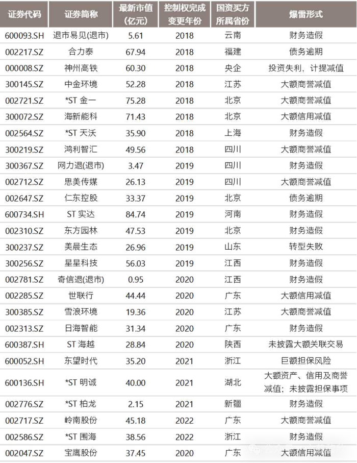 早期国资对收购上市公司经验不足,未能在尽职调查阶段识别出重大风险,导致收购后的“爆雷”时有发生。以下为2018年以来部分被国资收购后爆雷的上市公司,80.77%上市公司被收购的时间发生在2018-2020年。就爆雷形式而言,主要可划分为大额减值(包括资产、信用、商誉)、财务造假、债务逾期、其他违法违规行为(未披露关联交易)等。
