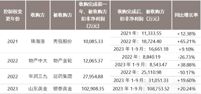 国资买方选择收购主业与自身存在协同效应的上市公司也使得国资在收购后能够迅速介入被收购上市公司的生产经营,从而使得收购有更大概率取得较好的结果。如物产中大(600704.SH)收购的物产金轮(002722.SZ)原有主业包括针布和不锈钢加工,而物产中大本身就有较大规模的不锈钢加工业务。在完成收购后,物产中大主导的董事会给物产金轮在经营方面制定了“向高端、向海外、向新领域”的实现路径,以期成为具有国际竞争力的工业品细分领域标杆。尽管下游行业存在景气度下滑的趋势,但得益于国资买方的精准化管理、充分发挥双方的协同作用,物产金轮2023年前三季度扣非净利润为8,543.47万元,同比增长了38.88%。