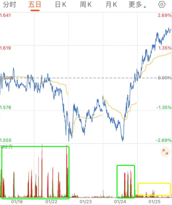 黄框是今天成交量,比前几天的成交量(绿框),有了明显减少,说明国家很可能停了手。
