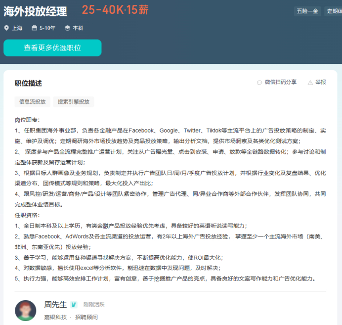 独角金融注意道,嘉银科技不久前还在招聘海外投放经理,并对其开出了37.5—60万元的年薪。该岗位任职集团海外事业部,负责各金融产品在国际主流平台上的广告投放策略的制定、实施、维护及调优;定期调研海外市场投放趋势及竞品投放策略,提供优化测试方案。