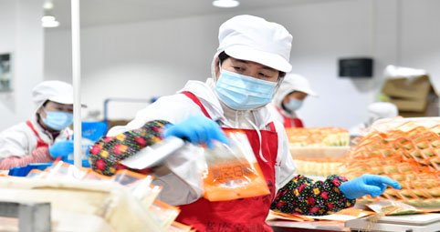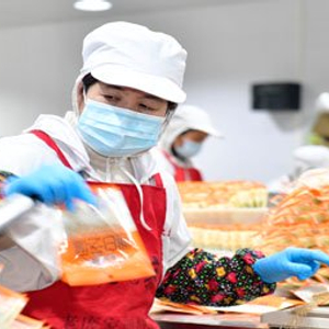 近年来,山东省乐陵市杨安镇聚力发展调味品产业,同时配套建设调味品产业共建共享实验室,检测涵盖复合调味品、辣椒酱、酱油等,不断加强完善产品质量管理体系建设。目前,乐陵市已形成涵盖生产加工、冷链物流、运输包装、检验检测等环节的调味品全产业链,成为全国重要的调味品生产基地。据悉,乐陵市调味品种类达1200种,远销70个国家和地区,年产值达220亿元。图为工作人员在乐陵市杨安镇调味品产业园包装调味品。