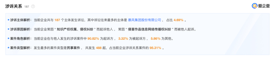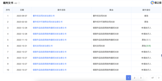爱企查显示,森宇股份存在462份裁判文书,以著作权合同纠纷和侵害作品信息网络传播权纠纷为主。森宇股份常因 “ 知识产权权属、侵权纠纷 ” 而起诉他人 , 90.82%为原告方。