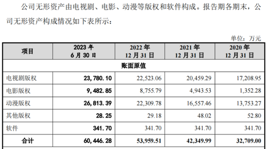 作为数字版权商,版权无疑是森宇股份最重要的无形资产。《招股书》显示,截至2023年6月30日,森宇股份的无形资产为6.04亿元。主要由电视剧、电影、动漫等版权和软件构成,其中以动漫和电视剧版权为主,分别为2.68亿元、2.38亿元。