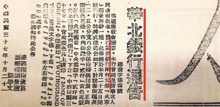 图为华北银行在1948年10月28日人民日报刊发的发行冀南银行钞票的通告。
