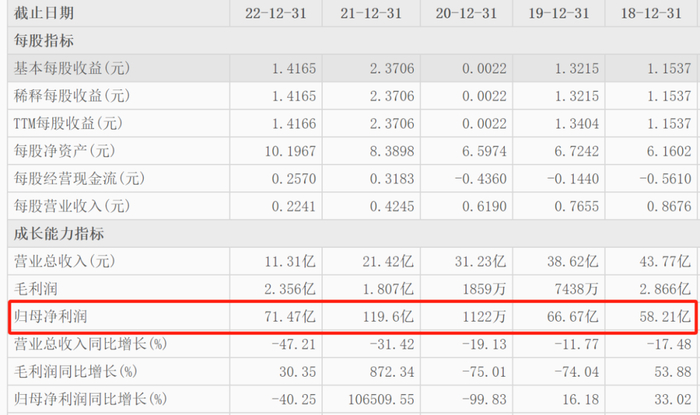 据财报显示,2018年至2022年5年间,华晨中国的营收分别为43.77亿元、38.62亿元、31.62亿元、21.42亿元和11.31亿元,分别下滑了17.48%、11.77%、19.13%、31.42和47.21%,连续5年都以超过10%的速度下滑,呈不断下滑趋势。但同期净利润则是58.21亿元、66.67亿元、1122万元、119.6亿元和71.47亿元,除了2020年净利润小于营收之外,其他4年净利润均大于营收,以2022年为例,营收11.31亿元,净利润则高达71.47亿元,净利润是营收的6.3倍。