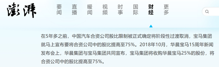 据《澎湃》报道,早在2018年华晨中国就被曝有出售股权的打算。2018年10月11日,华晨宝马在沈阳庆祝成立15周年生日,被曝出华晨中国宣布宝马集团将在2022年前成为拥有75%股权的大股东。