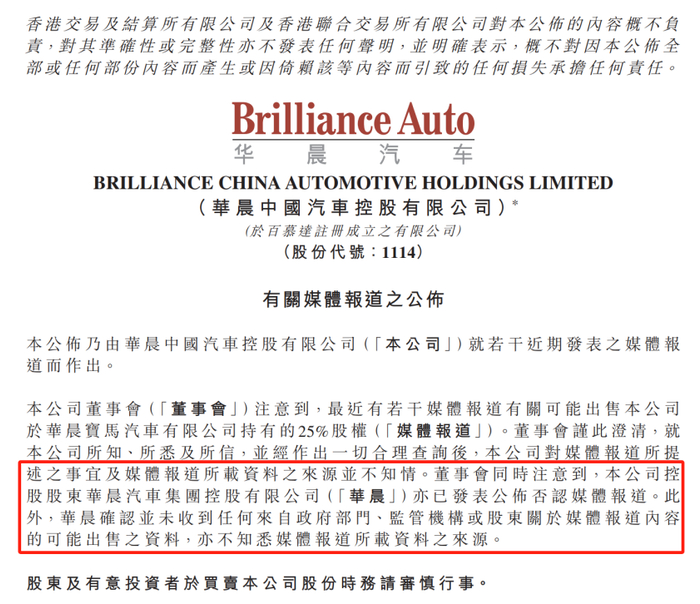 但随后事件出现转折,据《澎湃》报道,1月22日,华晨中国在港交所公告,公司董事会注意到,最近有若干媒体报道有关可能出售公司于华晨宝马汽车有限公司持有的25%股权。董事会谨此澄清,就公司所知、所悉及所信,并经作出一切合理查询后,公司对媒体报道所提述之事宜及媒体报道所载资料之来源并不知情。