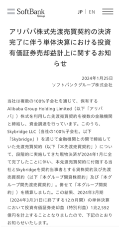 2022年8月10日,软银宣布,董事会同意结算至多2.42亿份阿里巴巴ADR(“美国存托股份”)的远期合约,预计交易总收益达4.6万亿日元(约合340亿美元,折合人民币2300亿元),结算完成后,软银持有的阿里巴巴股份占比将从23.7%降至约14.6%。