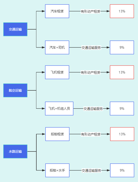 (1)根据财税[2016]36号文附件一《销售服务、无形资产、不动产注释》的规定,水路运输的光租业务、航空运输的干租业务,属于经营租赁。水路运输的程租、期租业务,属于水路运输服务。航空运输的湿租业务,属于航空运输服务。经营租赁业务,按照有形动产租赁税目征税,税率为13%;运输服务,按照交通运输服务征税,税率为9%。