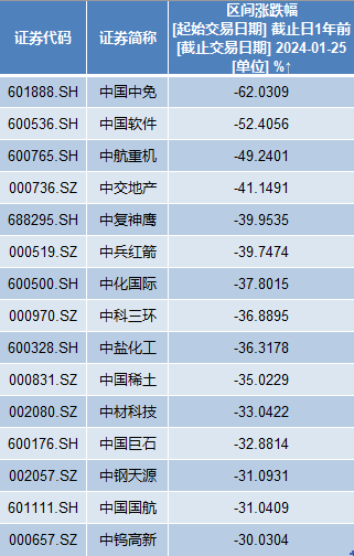 例如,中国中免(601888)近1年跌幅超过60%,中国软件(600765)跌幅超过50%。中航重机(600765)、中交地产(000736)跌幅超过40%。中国稀土(000831)、中国巨石、中国国航(601111)等,跌幅同样超过30%。