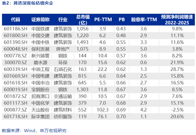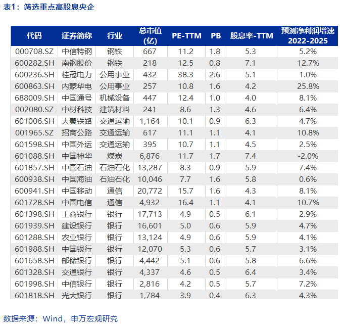 配置方面,申万宏源证券建议投资者关注两类标的:一是高股息央企,二是绝对低估值央企。