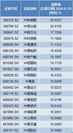 个股方面,中铁装配(300374)、中信出版(300788)、中船汉光(300847)、中科信息(300678)、中铝国际(601068)等近30只个股涨停或涨超10%,中国石油(601857)更是时隔8年半后再度涨停。
