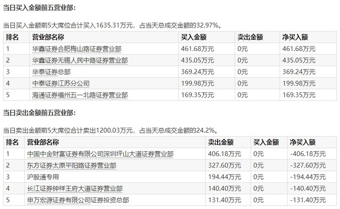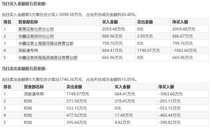 具体来看,机构买入300.76万元,卖出1998.3万元,合计净卖出1697.54万元。此外,麦高证券北京分公司、华鑫证券深圳分公司分别买入2059.48万元、888.96万元;深股通专用、华鑫证券深圳分公司分别卖出1748.07万元、2.89万元。华鑫证券深圳分公司被市场推测为知名游资营业部。
