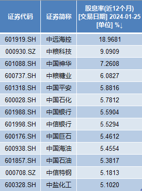 此外,中国平安(601318)、中国石化(600028)、中国银行(601988)、中信银行(601998)、中国巨石(600176)、中国海油(600938)、中国石油、中信特钢(000708)、中盐化工(600328)等成分股,股息率均在5%以上。