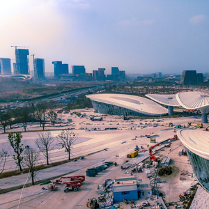 几栋钢质建筑相连,形似一朵绽放的“芙蓉花”,呼应着2024成都世园会“芙蓉花开”的主题——这里是2024成都世园会主会场的综合服务馆,也将是游客进入园区的第一道风景。