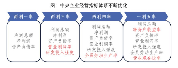 国企改革深入推进,“一利五率”助力央企估值重塑。2023年相关部门进一步优化完善中央企业经营指标体系,将“两利四率”调整为“一利五率”。其中最大变化,“一利五率”将此前的净利润替换为ROE,将营业收入利润率替换为营业现金比率。经营指标的调整将引导国企经营更注重效率和现金流情况,未来有望提升盈利能力和质量,更加符合资本市场的审美。