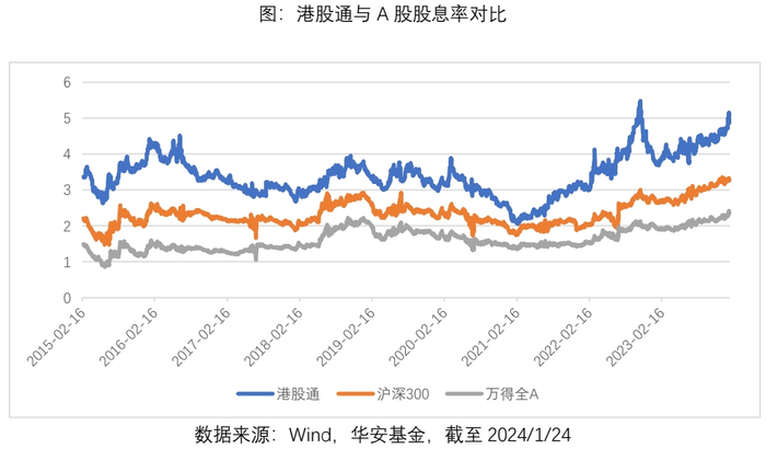 对比港股与A股,港股市场的高分红央企具备更高股息率与更优性价比。港股通具备良好的红利投资土壤,长期以来,港股通成分股的股息率整体高于A股。同时,港股受市场情绪影响当前估值处于低位,AH股溢价率走阔,投资性价比较高。